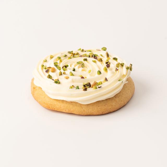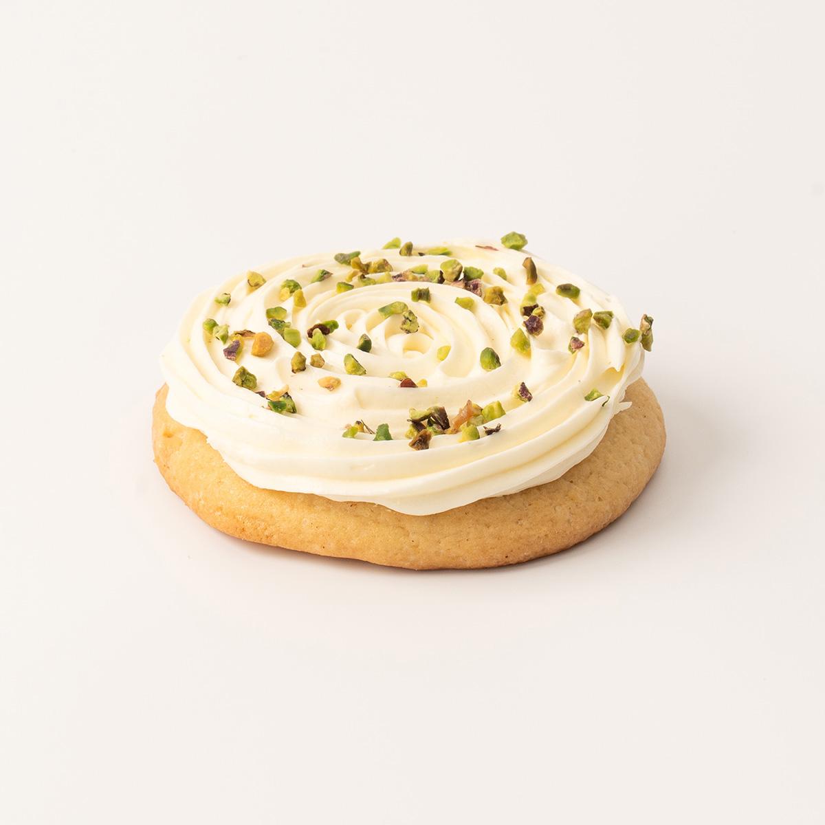 White choc chip cookie with pistachio filling. Topped with mascarpone icing, and pistachio pieces.